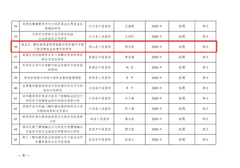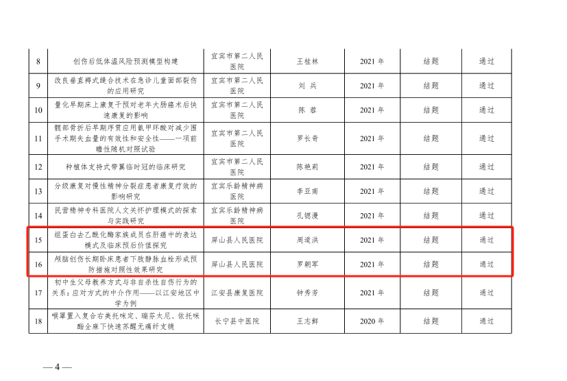 12月19日,在《宜宾市卫生健康委关于公布2020-2021年立项医学科研项目验收结果的通知》中,屏山县人民医院三项科研项目成功通过验收。