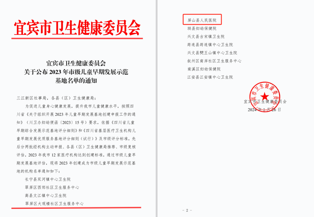 1月26日,宜宾市卫生健康委传来好消息,在宜宾市卫生健康委发布的《宜宾市卫生健康委员会关于公布2023年市级儿童早期发展示范基地名单的通知》中,屏山县人民医院成功通过市级儿童早期发展基地评估,成功创建成为市级儿童早期发展示范基地机构。